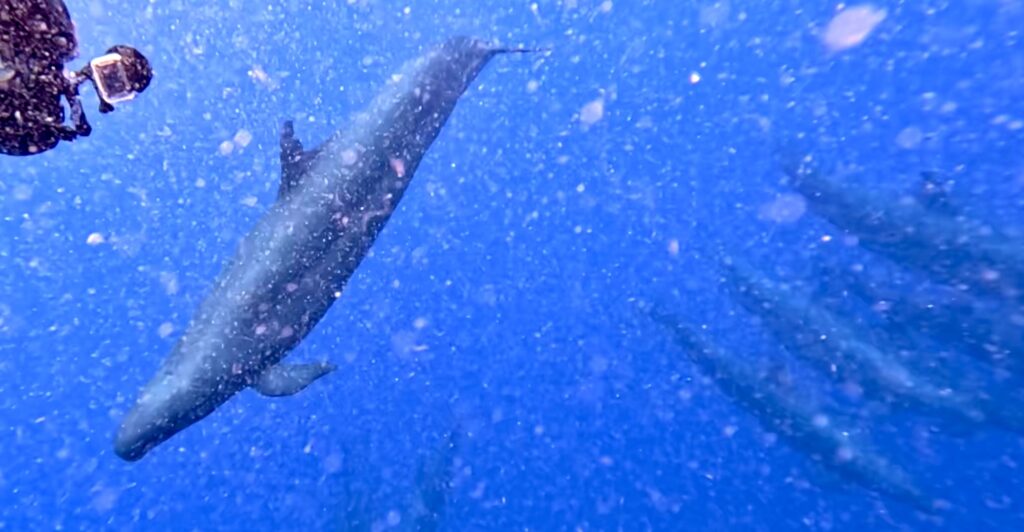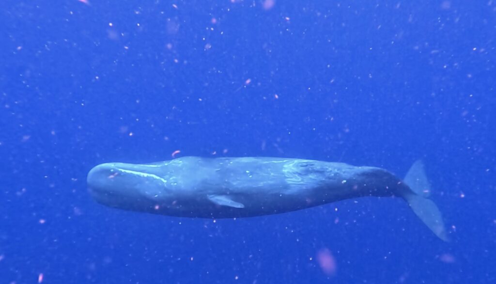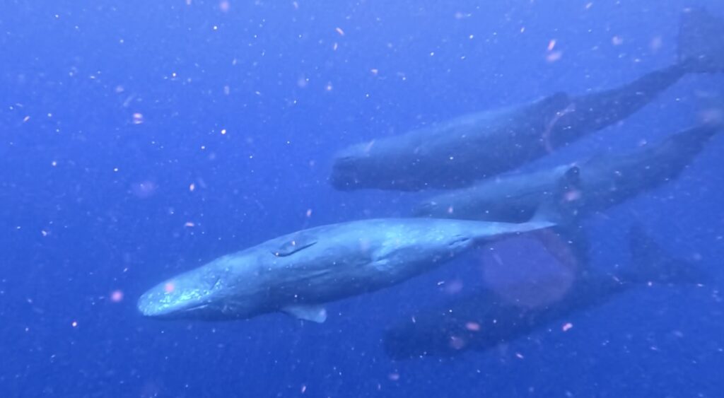 オキゴンドウと泳いでいると、近くでマッコウクジラも上がってくれ、スイム♪
